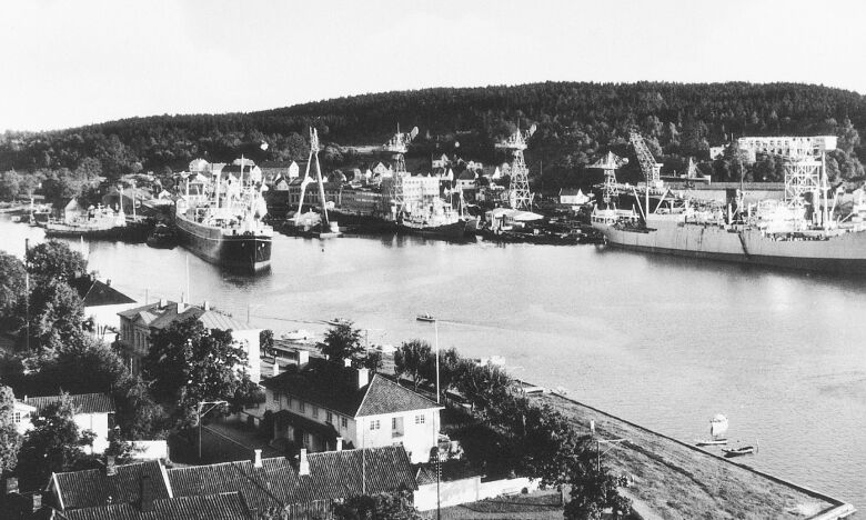 Bilde: Kaldnes sett fra bysida den gangen skipsverften var i gang.