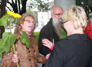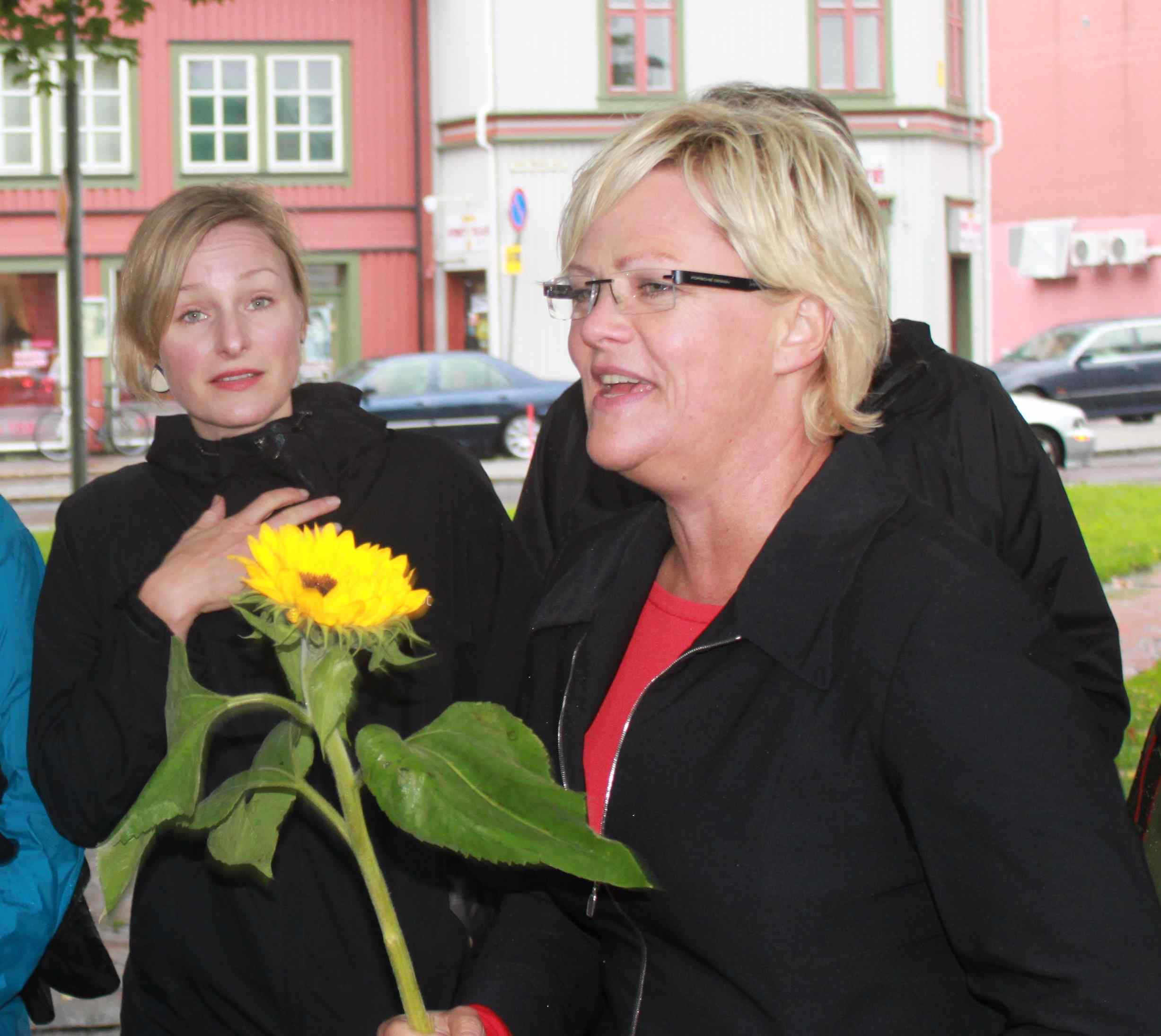 oppslutning om SV. Som gode Svere reiser de kollektivt, i en buss som selvfølgelig har høyeste miljøklarering – sjøl om VG spekulerer i noe annet. Der de ankommer illustrerer de SVs politikk ved at Kristin overrekker solsikker til noen menensker som lokallaget har foreslått. I Tønsberg var det Per og Ellen – som har vært i et