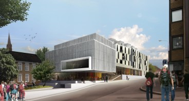 Bildet: TKE har endret fargen på bygget. laget et bilde med litt større avstand til bygget og litt flere mennesker i håp om å selge det inn. Men det passer fortsatt like dårlig til nabobygget, den gamle allmueskolen.