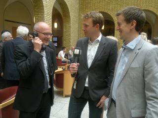 Bildet: Aslak M. Eriksrud fra TV2, Erling Sande som er komiteleder i Energi og miljøkomiteen, fraksjonsleder for SP og meg i Stortingets Vandrehall.