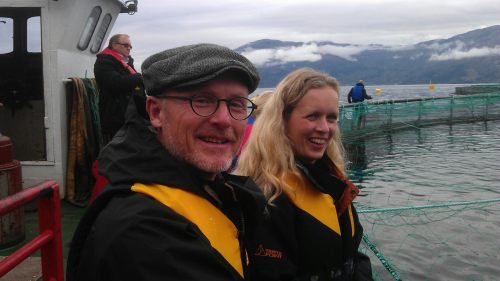 Ingvill Størksen som er politisk rådgiver for Sp i Energi og Miljøkomiteen, og jeg på Lingalaks sitt oppdrettsanlegg