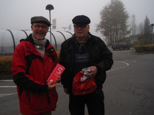 Da snur folk seg, smiler og sier takk i like måde. Bare en mann strenet sint videre og mumla at han skulle faen ikke ha noen god dag, når det var en Sver som ønsket det for han! Men stort sett har det vært en oppmuntrende tur. Folk er interessert i å snakke, de er vennlige, er med på en fleip, vi bruker galgenhumor og forteller at vi er jo nødt til å starte valgkampen så tidlig, så dårlig som det står til med partiet vårt!