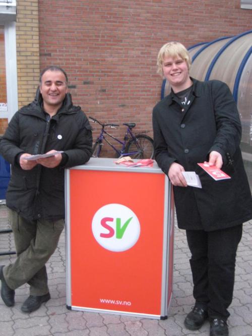 Etter å ha stått litt på stand i dag i Sandefjord, fant vi ut at vi måtte avslutte et annet sted for å holde motet oppe. Så vi – Hiam, Carl og jeg – satte kursen mot Nordbysenteret i Larvik. Rett før vi kjørte inn til senteret, passerte vi to jenter som gikk på sykkelstien og VINKA TIL OSS! Larvik er annerledes enn Sandefjord. En tydelig forskjell for oss SVere: Her er det helt bemerkelsesverdig flere som tar i mot, kommer med oppmuntrende ord og er interessert.