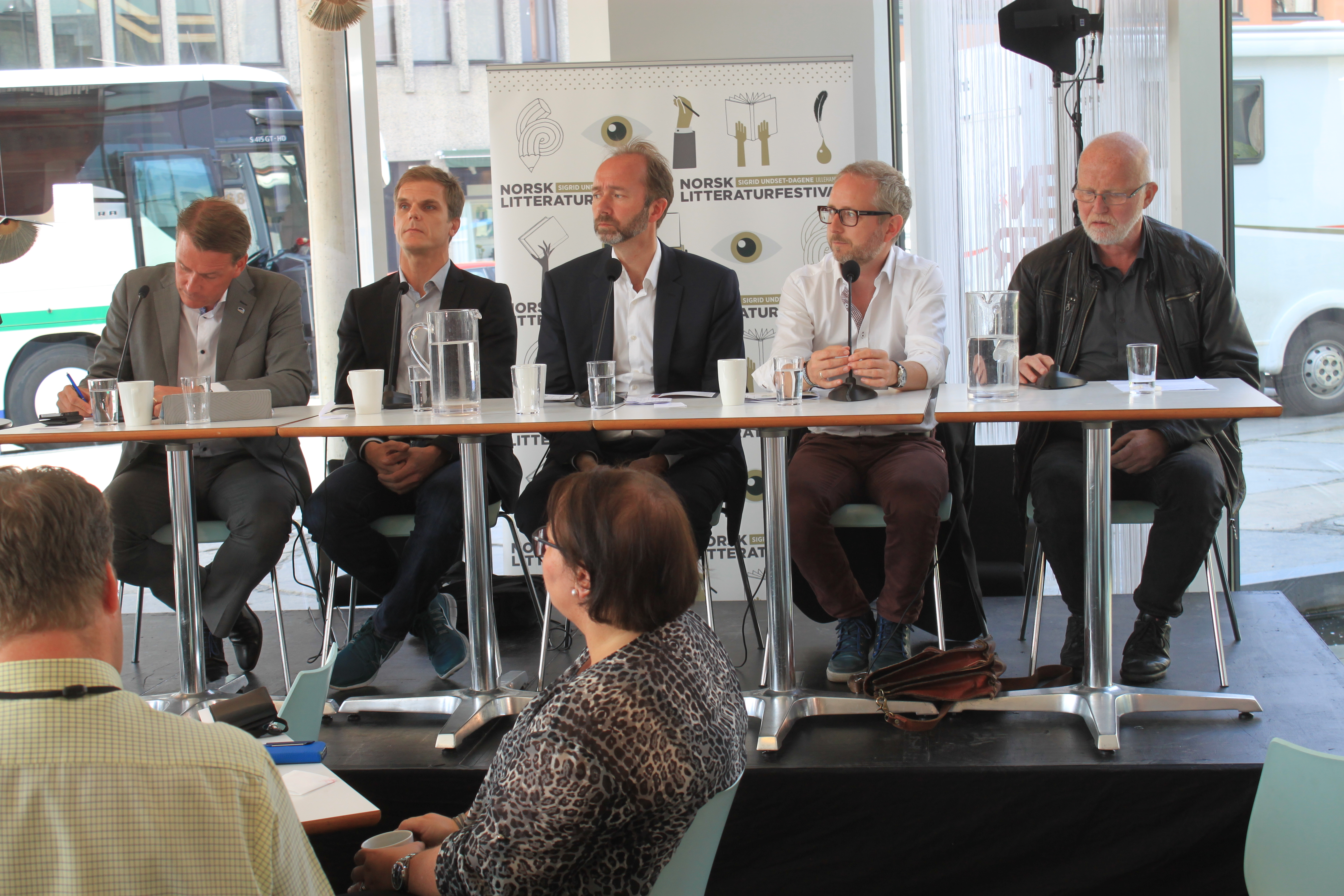 Bibliotekdebatt. Fra venstre Kårstein Eidem Løvaas (H), Erik Henningsen, Kulturutredningen, Trond Giske (AP), Bård Vegar Solhjell (SV) og Ragnar Audunsson, HIOA.