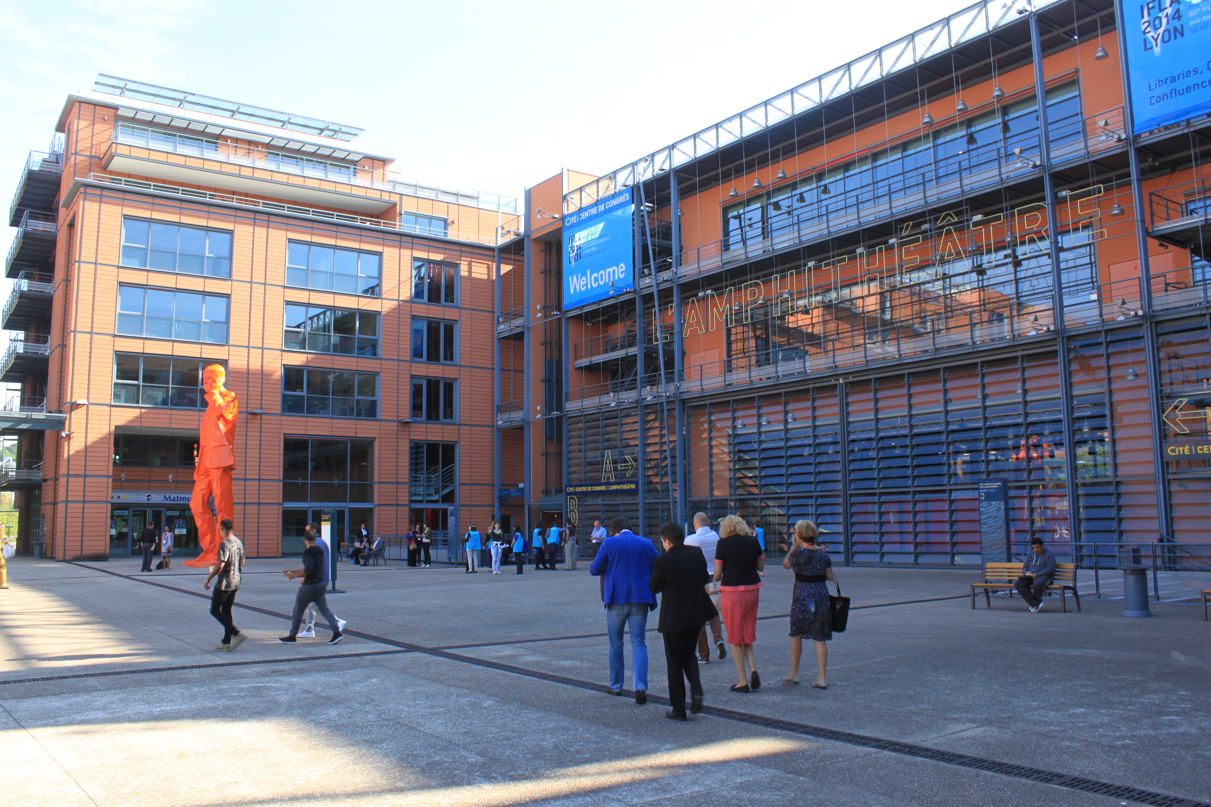 Den formelle åpningen av konferansen foregikk i dag søndag. Det var innlegg ved lederen av den franske konferanse-komiteen, ordføreren i Lyon, lange videohilsener fra to statsråder og en statssekretær, samt hovedtalen som ble holdt av en professor i multimedia. I tillegg var det en lang presentasjon av Lyons rolle innen filmhistorien. Det ble sikkert sagt mye bra, men jeg fikk det dessverre ikke med meg. For jeg kan dessverre ikke fransk. Jeg var ikke aleine om det, og det tok visst arrangørene på senga. Køen for å få øretelefoner til simultan-tolkingen var endeløs lang, og når jeg var kommet halvveis, var det slutt på øretelefoner. Selsomt å sitte i to timer og bare forstå et ord nå og da. Men IFLAs president Sinikka Sipilä snakket engelsk i sin korte hilsningstale med vakker finsk aksent!