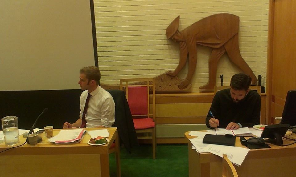 Snorre Valen lytter, mens rådgiver Kim Andre Åsheim noterer flittig