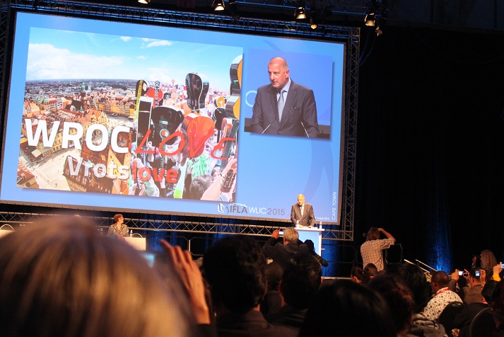 Det mange var spent på var hvem som var blitt valgt til å være hjemby for IFLA-konferansen i 2017. Det ble Wroclav i Polen: En by som på mange måter representerer det multikulturelle Europa. Fram til 2. verdenskrigs slutt var byen en del av Tyskland under navnet Breslau. Annen verdenskrig innebar 100% utskiftning av hele befolkningen. Tyskerne ble jaget vestover, folk fra øst-Polen – dagens Hviterussland og Ukraina – ble flyttet til Wroclav. For å sette et polsk stempel på byen ble også store polske bibliotek flyttet med til Wroclav. I dag er byen stolt av sin fortid – stolt over å være en by med over 70 navn på ulike språk som har hatt tilknytning til byen.