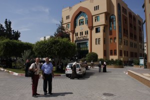 Meg, Aslak og Miriam foran UNDP-bygget i Gaza. Det flotteste bygget i byen?
